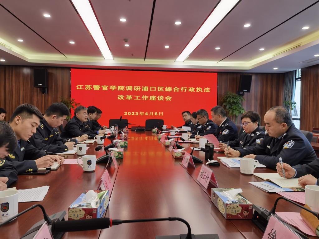 教官团队在浦口区综合行政执法局办案区观摩了案件管理系统运行情况,观看了浦口区综合行政执法体制改革专题片,听取了浦口区综合行政执法局负责同志的情况介绍,并与首期培训班学员进行了座谈交流。