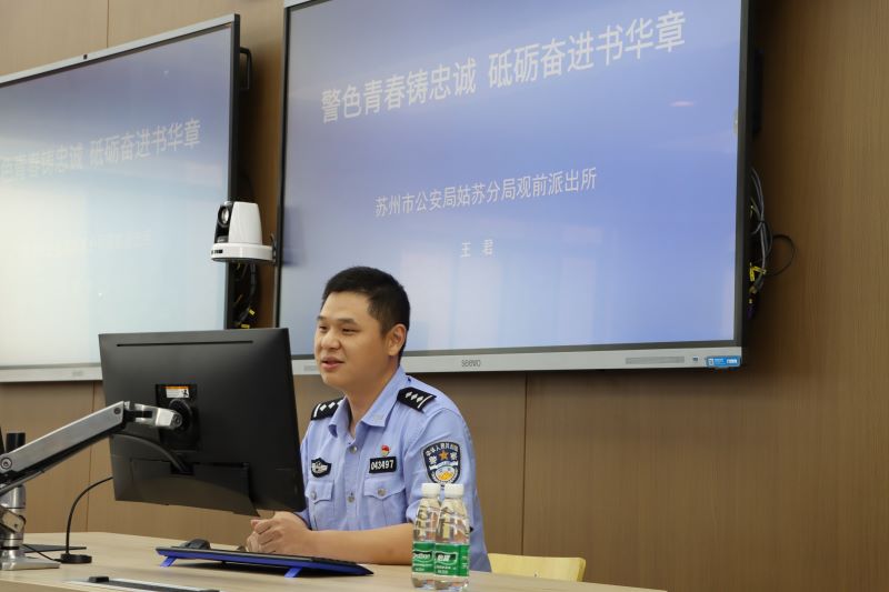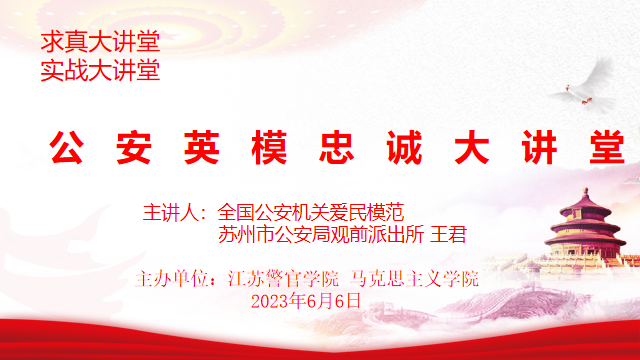为深入开展学习贯彻习近平新时代中国特色社会主义思想主题教育,充分发挥忠诚警魂教育等大思政课在立德树人中的重要作用,坚持不懈用习近平新时代中国特色社会主义思想铸魂育警,激励引导青年学警学习英模事迹,感悟英模精神,砥砺从警初心,不忘入警使命,6月6日,马克思主义学院邀请全国公安机关爱民模范、我校2011届校友、苏州市公安局观前派出所副所长王君开展“公安英模忠诚大讲堂”宣讲活动。